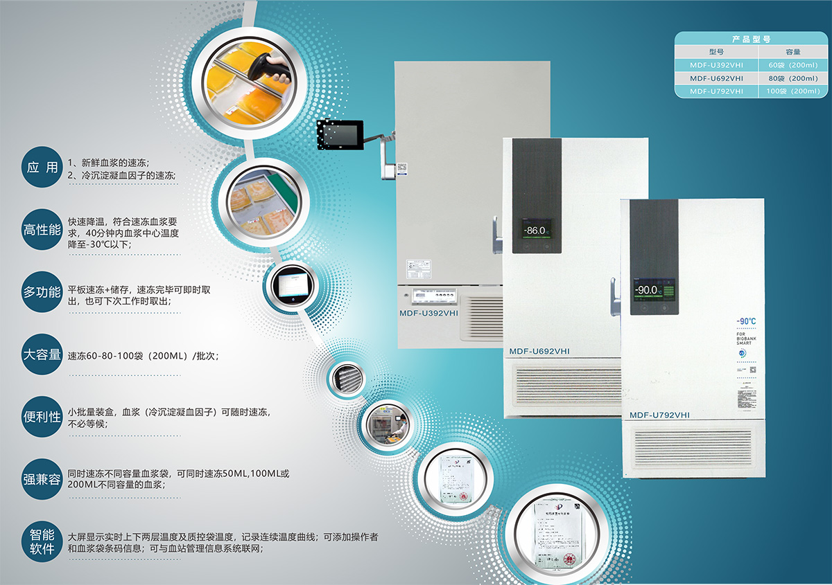 7、兼容性:同时速冻不同容量血浆袋,可同时速冻50ml, 100ml或200ml不同容量的血浆;